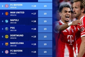 2、拜仁2025/26賽季15分19個凈勝球