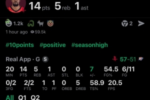 他上半場多次在打不開局面的情況下強行解決問題,20分鐘的時間里,投籃11中6,三分球2中0,罰球2中2,拿下全隊最高的14分外加5籃板1助攻的數(shù)據(jù),正負值+7。