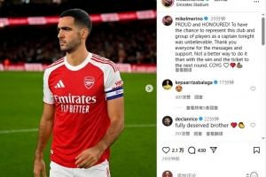 梅里諾寫道:“自豪與榮幸!今晚能有機會作為隊長代表這家俱樂部和這群球員出戰,感覺難以置信。感謝所有人的留言和支持,沒有比用一場勝利和晉級下一輪更好的方式來慶祝了,槍手加油!????????”