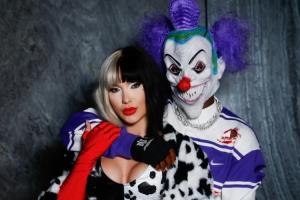 維尼修斯打扮成紫色的小丑,女友弗吉尼亞則cos了迪士尼動畫《101忠狗》中的經典反派角色庫伊拉,一同出cos的還有她與前夫的三個孩子。