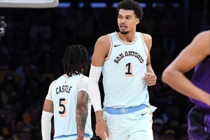 談到比賽中和文班的那次空接時,卡斯爾說道:“他跟我說往月球上扔。那個球真的是往月球扔,而他接住了。”