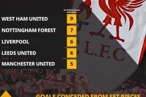 根據OPTA的數據統計,本賽季英超中僅諾丁漢森林(9球)和西漢姆聯(7球)比利物浦(6球)在定位球方面丟球更多,而諾丁漢森林和西漢姆聯均身處降級區。另外,利茲聯在定位球丟球方面和利物浦同樣多,曼聯則丟了5球。