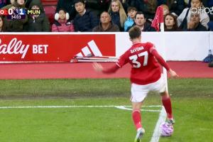 但慢鏡頭顯示,森林后衛控球未出界,主裁判仍然判給曼聯角球。