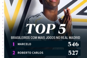 維尼修斯追平卡塞米羅,成為皇馬隊史出戰比賽第3多的巴西球員,位居他身前的是馬塞洛(546場)以及卡洛斯(527場),羅德里戈以281場位居第5。