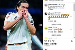 卡雷拉斯社媒曬出親吻皇馬隊徽的照片,配文:“很多進球中的第一個。我愛你,皇馬。”