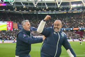 下半場補時第5分鐘,紹切克補射破門幫助西漢姆鎖定勝局,主帥努諾在場邊與教練組激動相擁。