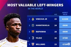 體育資訊11月3日訊 德轉列當前世界足壇左邊鋒身價排行,維尼修斯1.5億歐居首,克瓦納茨赫利亞、拉菲尼亞9000萬歐并列第二。