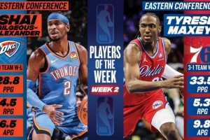 體育資訊11月4日訊 今日NBA官方公布了2025-26賽季第二周東西部最佳球員,馬克西和亞歷山大分別當選。