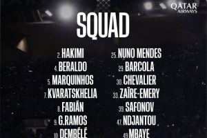 巴黎對陣拜仁大名單:登貝萊、阿什拉夫領銜,扎巴爾尼、杜埃缺席