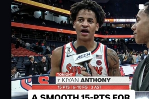 體育資訊11月5日訊 在昨天的一場NCAA比賽中,雪城大學85-47大勝賓漢頓大學。卡梅隆·安東尼之子基揚·安東尼完成了大學正式比賽的首秀。