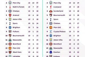 體育資訊11月06日訊 英超官方社媒更新動態,官方曬出了24/25賽季和本賽季聯賽在10輪過后的積分榜情況,并配文:你注意到了什么?