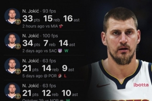 體育資訊11月6日訊 NBA常規賽,掘金122-112擊敗熱火。約基奇拿到33分15籃板16助攻3搶斷,正負值+18。