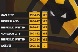 狼隊(duì)前10輪僅拿2分,英超歷史同期積分持平或更少球隊(duì)最終均降級(jí)