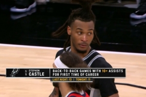 目前,二年級新秀卡斯爾已經得到12分2籃板11助攻2搶斷;據統計,卡斯爾連續兩場比賽助攻上雙,個人職業生涯首次。