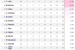 根據(jù)OPTA超級計算機的預(yù)測,狼隊的降級概率已高達90.31%,伯恩利降級概率也超過5成為50.12%,排在伯恩利身后的為諾丁漢森林(44.92%)、利茲聯(lián)(41.26%)、西漢姆聯(lián)(40.33%)以及富勒姆(14.85%)。值得一提的是,身為升班馬的桑德蘭表現(xiàn)驚艷,目前他們在英超中高居第4位,降級概率僅為7.49%。