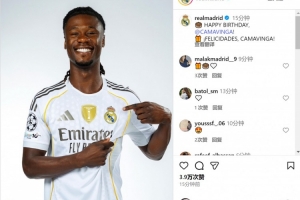 皇馬官方社媒曬出卡馬文加的照片,配文:“生日快樂,卡馬文加!”