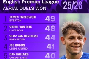 體育資訊11月11日訊 英超聯賽已經進行了11輪,squakwa也統計了本賽季英超空中成功對抗次數,塔科夫斯基力壓范戴克居首。