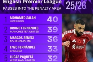 本賽季英超傳球入禁區(qū)次數(shù)榜:薩拉赫壓B費(fèi)居首,恩佐、扎卡在列