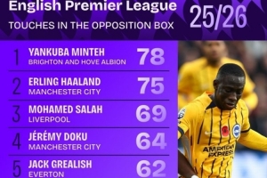體育資訊11月11日訊 英超聯賽已經進行了11輪,squakwa也統計了本賽季英超在對方禁區內觸球次數情況,明特力壓哈蘭德居首。