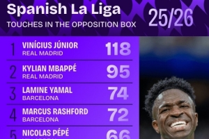 體育資訊11月12日訊 本賽季西甲進(jìn)行了12輪比賽,Squawka統(tǒng)計(jì)了在對(duì)方禁區(qū)內(nèi)觸球次數(shù)榜,維尼修斯118次居首,姆巴佩、亞馬爾二三位。