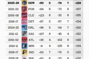據統計,勇士本賽季至今12場比賽,主場凈勝對手80分,客場凈負79分,主客場凈勝分差值達到159,創下了本世紀以來所有球隊賽季前12場比賽的最懸殊紀錄。