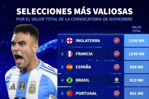 體育資訊11月15日訊 德國轉(zhuǎn)會(huì)市場(chǎng)統(tǒng)計(jì)了11月國際比賽日各國家隊(duì)的身價(jià),并列出榜單,英格蘭、法國、西班牙前三,阿根廷排在第九位。