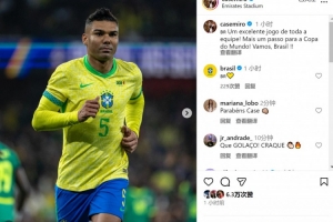 卡塞米羅社媒曬出比賽照片,寫道:“全隊都表現出色,向世界杯又邁進一步!加油巴西!”