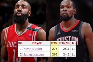 在代表火箭出戰的前11場比賽中,杜蘭特合計得到276分,超越哈登(266),隊史最多。