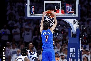 雷霆內線霍姆格倫上半場表現活躍,不僅有突破單手劈扣的精彩表現,籃板拼搶和防守上也充分發揮他的身高優勢和靈活性。