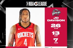 效力于毒蛇的火箭雙向合同球員JD·戴維森和以賽亞·克勞福德表現出色,分別貢獻26分7籃板13助攻,和27分7籃板。
