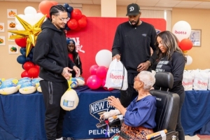 德安德烈·喬丹和米卡·皮維代表球隊向新奧爾良社區的居民發放火雞和感恩節食材,提前預祝球迷節日快樂。