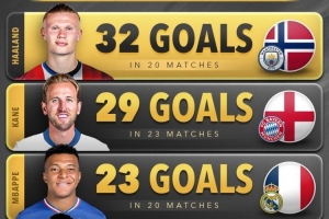 體育資訊11月17日訊 Score90統計了本賽季五大聯賽球員俱樂部+國家隊的進球數量,并列出榜單,哈蘭德32球居首,凱恩、姆巴佩二三位。