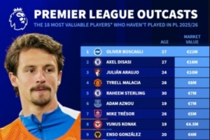本賽季英超未出場球員身價榜:博斯卡利2000萬歐居首,迪薩西第二