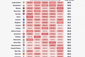 OPTA為各隊未來5輪聯賽的困難程度進行了量化打分,利茲聯賽程95.0分最困難,桑德蘭(93.6分)、狼隊(93.2分)、西漢姆(93.1分)、伯恩利(92.1分)分列二到五位。