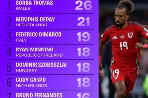 體育資訊11月20日訊 本屆世歐預小組賽已經告一段落,squakwa也統計了本屆賽事成功傳中情況,威爾士邊鋒索爾巴·托馬斯領跑。