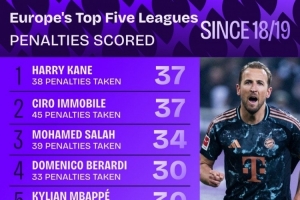 體育資訊11月21日訊 Squawka統計了2018-2019賽季以來球員在五大聯賽的點球進球數量,并列出榜單,凱恩、因莫比萊37球居首,薩拉赫34球第三。