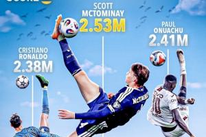 據Score 90統計,麥克托米奈的這粒倒鉤進球創造了新的世界紀錄,成為有史以來腳尖高度最高的倒鉤進球,超越了C羅在2018年對陣尤文時的經典倒鉤,以及奧努阿楚今年早些時候對陣卡拉古拉克時創造的紀錄。