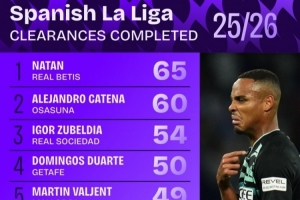 體育資訊10月7日訊 日前,Squawka統計了本賽季西甲解圍次數排行,貝蒂斯后衛納坦65次居首,祖貝迪亞54次第三。
