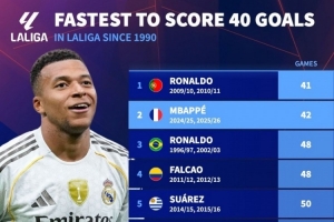 體育資訊10月8日訊 德國(guó)轉(zhuǎn)會(huì)市場(chǎng)列出了1990年以來(lái)最快達(dá)成西甲40球榜單,C羅41場(chǎng)居首,姆巴佩42場(chǎng)次席。
