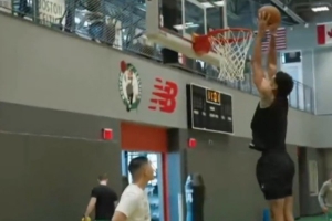 由視頻可見,塔圖姆已經可以在原地起跳完成雙手扣籃,塔圖姆配文寫道:“一定是鞋子的原因????。”